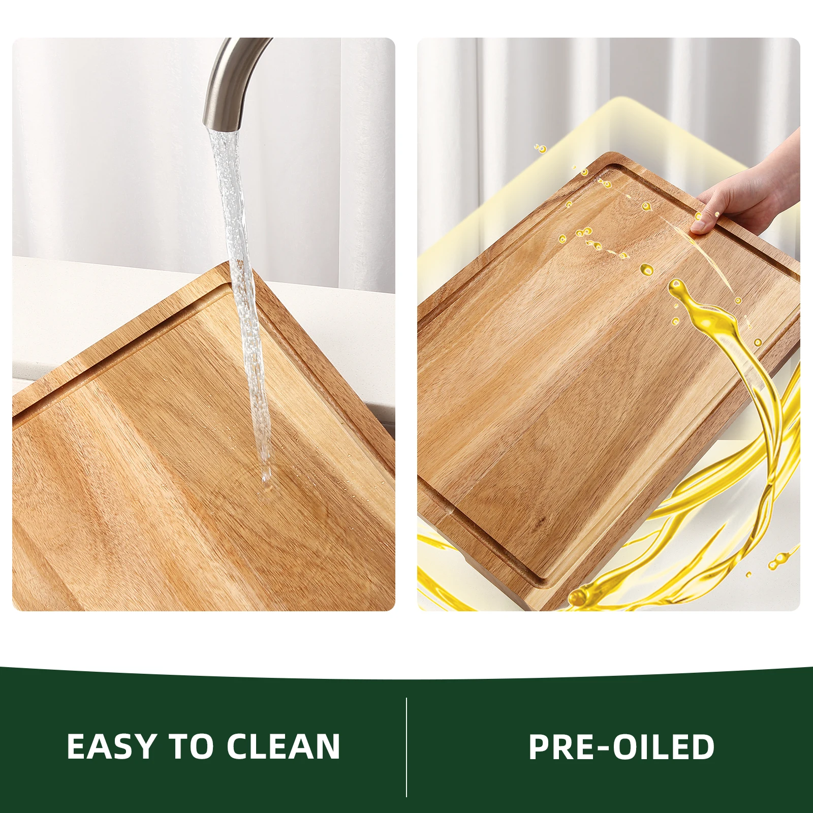 [Pre-Oiled Surface]: This acacia wooden cutting board comes pre-oiled, enhancing its natural beauty and protecting the wood. The pre-oiled surface provides a smooth and easy-to-clean cutting surface while also adding a rich finish to the board.