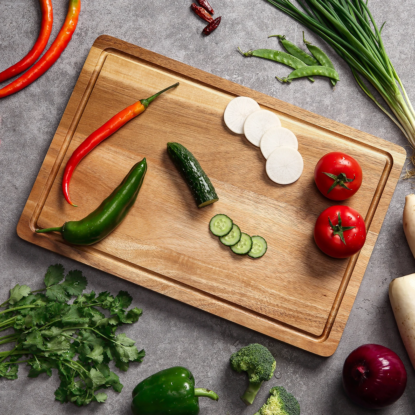 [Extra-Large Acacia Cutting Board]: This XL cutting board measures 18x12 inches, providing ample space for all your kitchen cutting and chopping needs. The generous size makes it ideal for preparing meats, cheeses, fruits, vegetables, and more.